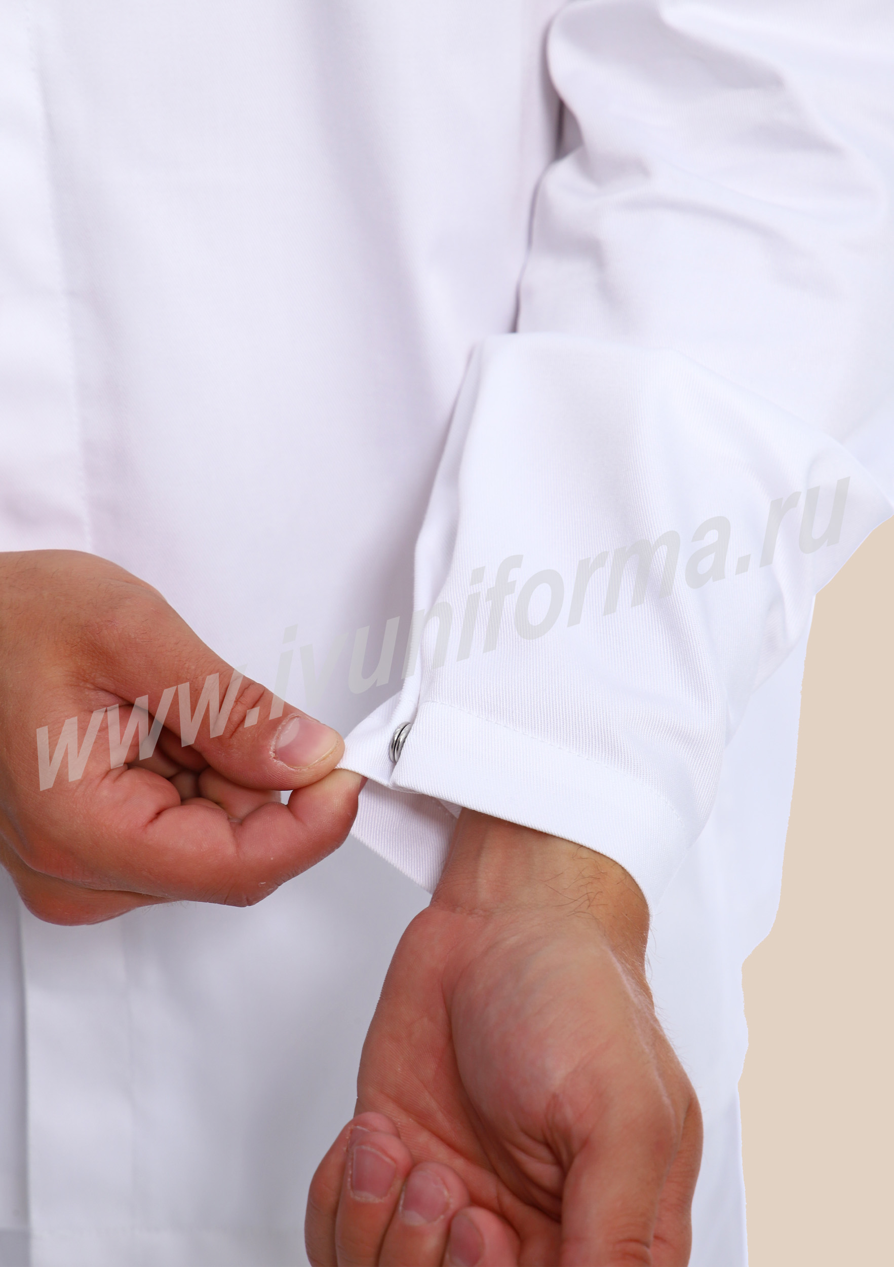 Костюм мужской состоит из куртки и брюк. Куртка удлиненная прямого силуэта с центральной потайной супатной застежкой на кнопки. Полочки с отрезными кокетками, спинка со средним швом. Рукав втачной длинный, прилегание рукава по низу регулируется кнопками. Воротник-стойка обеспечивает изоляцию кожных покровов в области шеи. В боковых швах куртки предусмотрены разрезы для легкого доступа в карманы брюк. Брюки прямые на эластичном поясе с верхними боковыми карманами с наклонным входом. Костюм предназначен для защиты от общих производственных загрязнений. Модель разработана в соответствии с международными требованиями безопасности пищевого производства согласно системе НАССР (ХАССП).